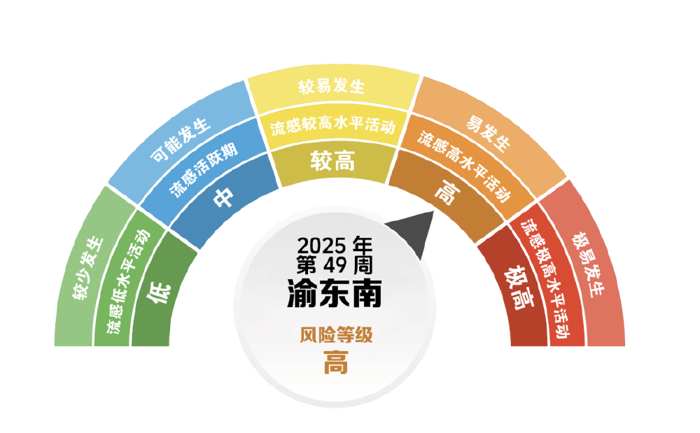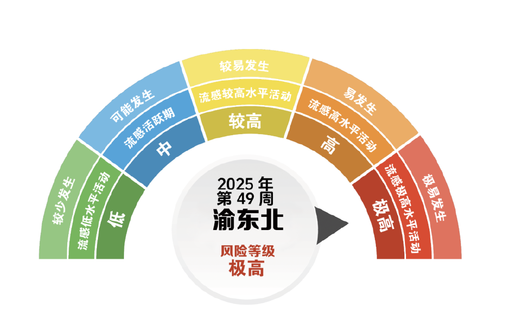 12月2日,重庆市疾控中心联合市气象服务中心发布2025年第49周(12月1日-7日)“流感风险等级与防控建议”,数据显示,当前全市流感处于流行高峰期,感染风险较前一周有所增高,低温天气将加大传播风险,建议积极接种流感疫苗,个人防护切勿松懈。