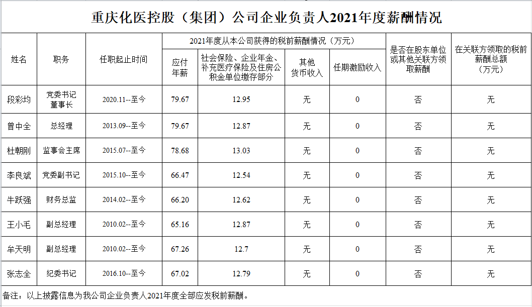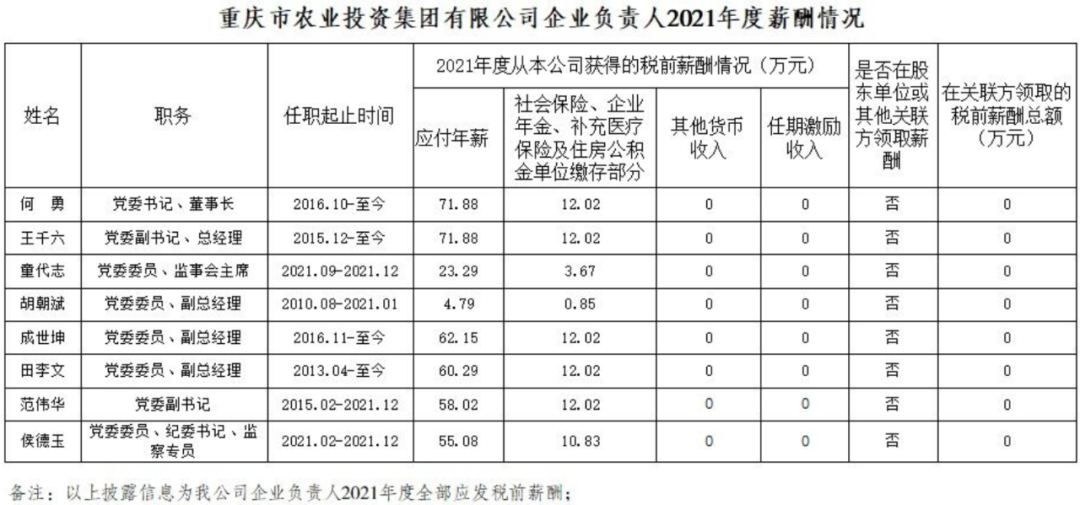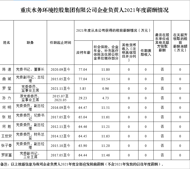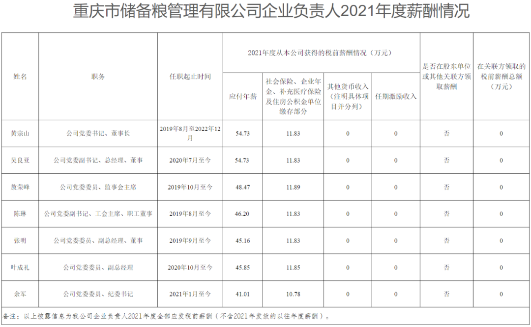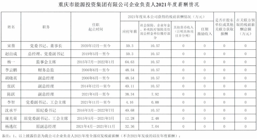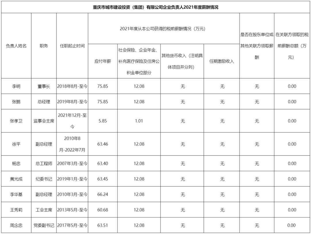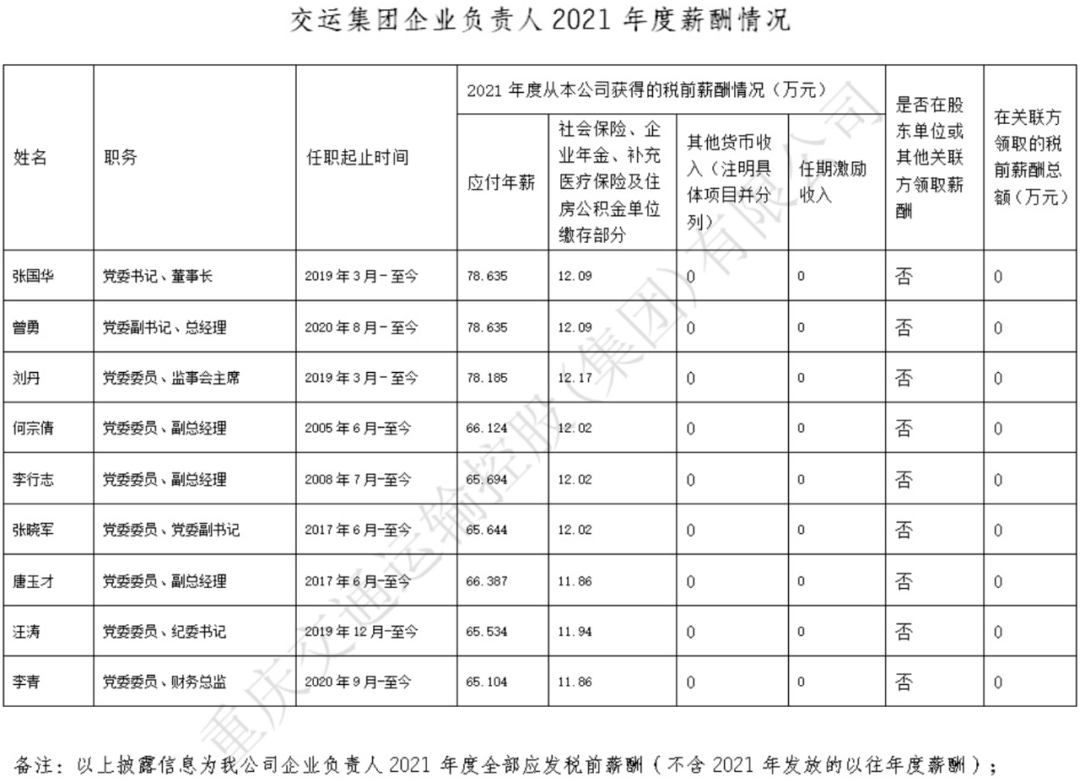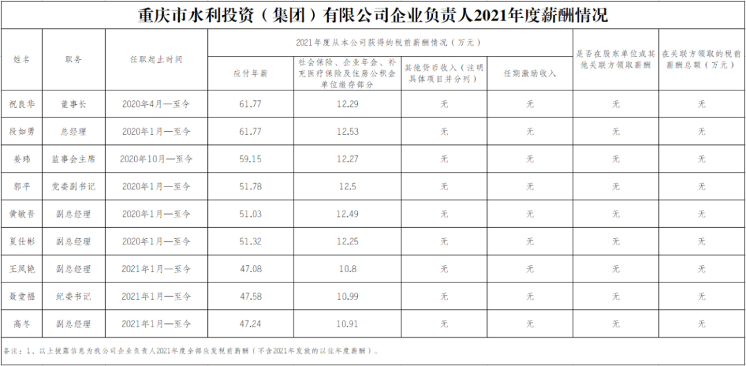 以下为重庆市33家市属国有重点企业负责人2021年度薪酬具体披露情况: