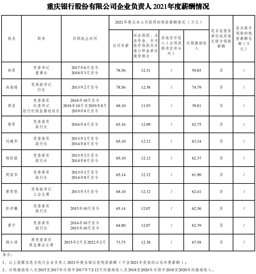 党委副书记、行长冉海陵 78.56万元