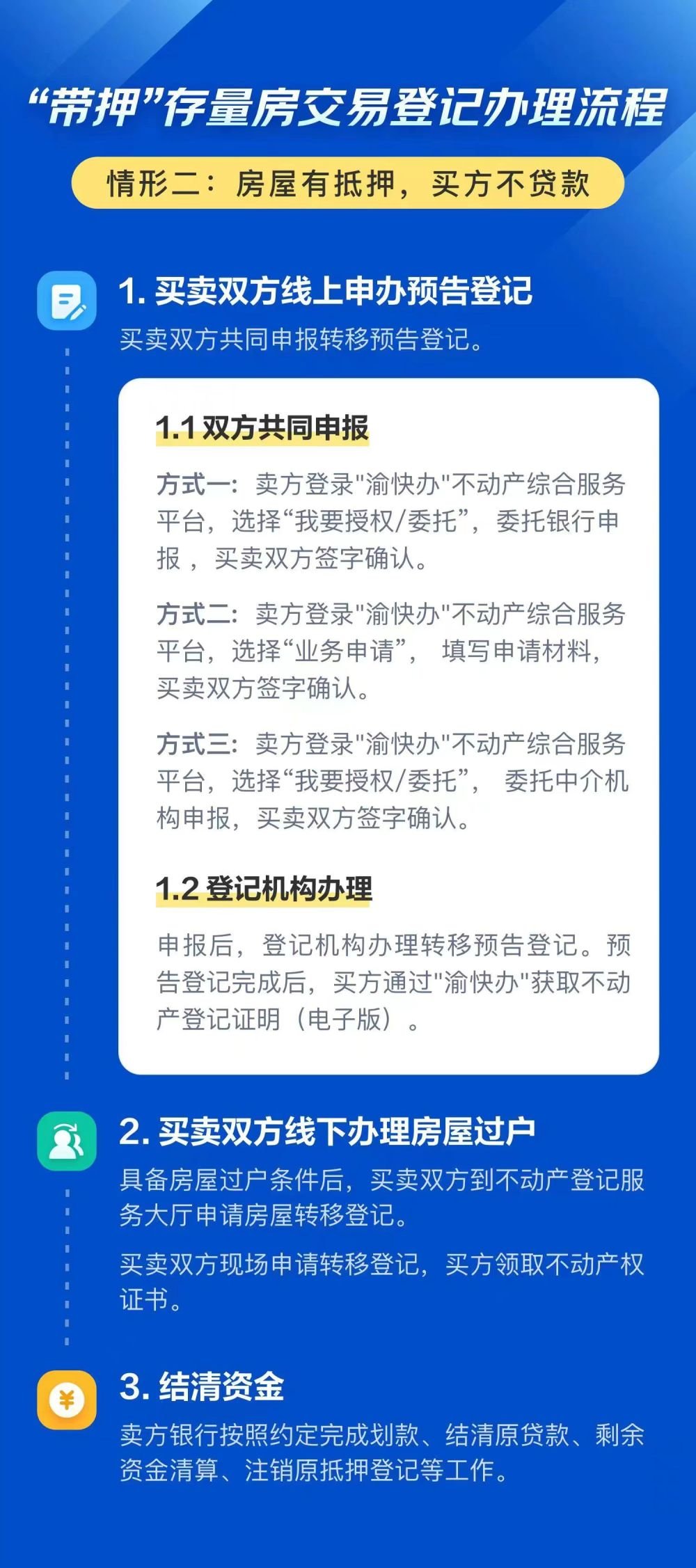 重庆再增一项二手房过户便民新举措。3月19日,记者从重庆市规划自然资源局获悉,重庆全面推行二手房双预告“带押过户”,并发布了涵盖二手房交易登记4种办事场景的流程图,供市民办事参考。