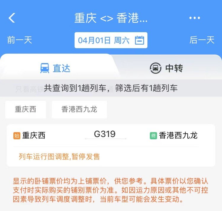 3月21日晚,通过查询铁路12306看到,已经能查询到4月1日重庆到香港的G319列车,不过目前还处于“列车运行图调整,暂停发售”的状态。
