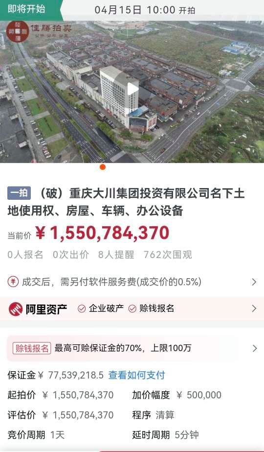 2023年4月15日10时至4月16日10时止,重庆大川集团投资有限公司(重庆大川集团)管理人将在淘宝网司法拍卖网络平台上,对重庆大川集团名下土地使用权、房屋、车辆、电子办公设备进行公开拍卖,起拍价为155078.437万元。