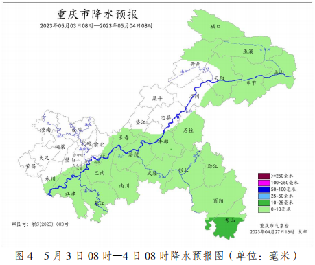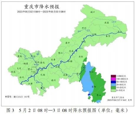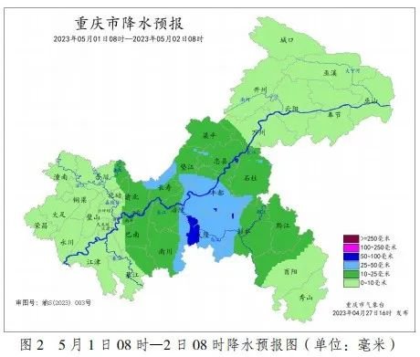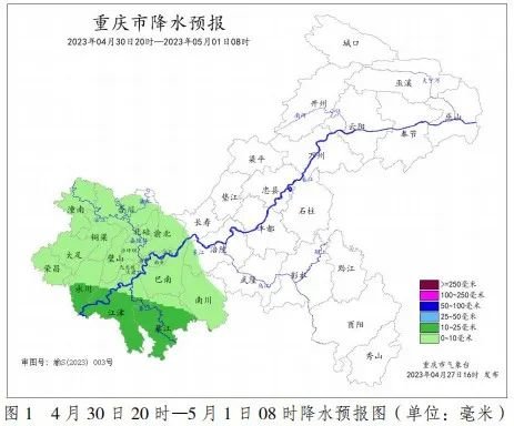 据气象部门预测,2023 年“五一节”期间(4月29日—5月3日),重庆市前晴后雨。其中,4月29日—30 日,各地多云为主,局地早上有雾;5月1日—3日,各地夜间到上午多阵雨或雷雨,局地伴有短时强降水和阵性大风等强对流天气。
