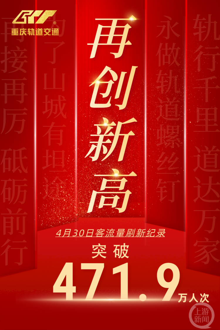 重庆交通开投轨道集团传来消息,4月30日,“五一”前一天,重庆轨道交通线网单日客运量创新纪录达471.9万人次,这是今年第6次刷新客流量的最高纪录,较4月28日468.8万人次的记录增长0.66%。