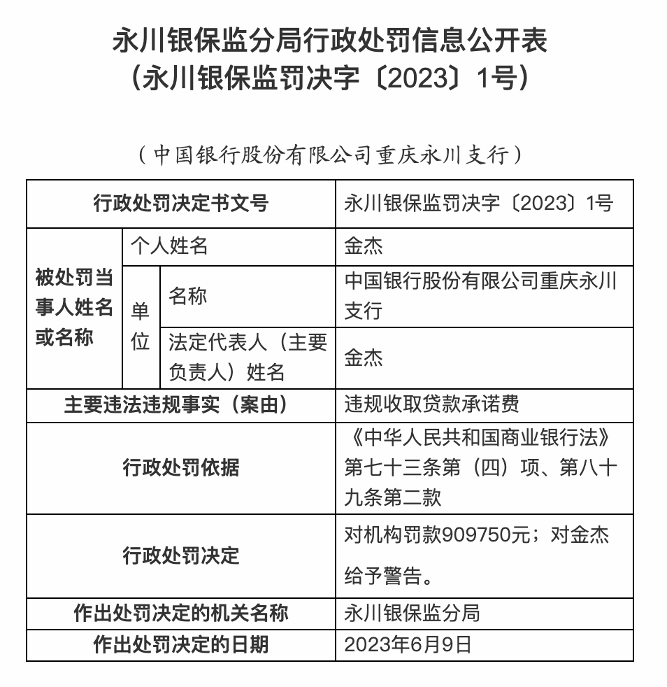 6月14日,重庆监管局公开信息显示,中国银行股份有限公司重庆永川支行因违规收取贷款承诺费,被罚909750元。