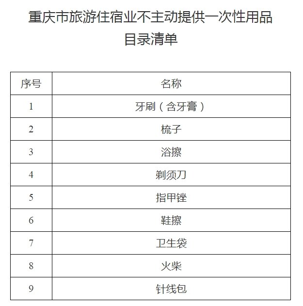 《重庆市旅游住宿业不主动提供一次性用品目录清单》将牙刷(含牙膏)、梳子、浴擦、剃须刀等一次性用品纳入其中。