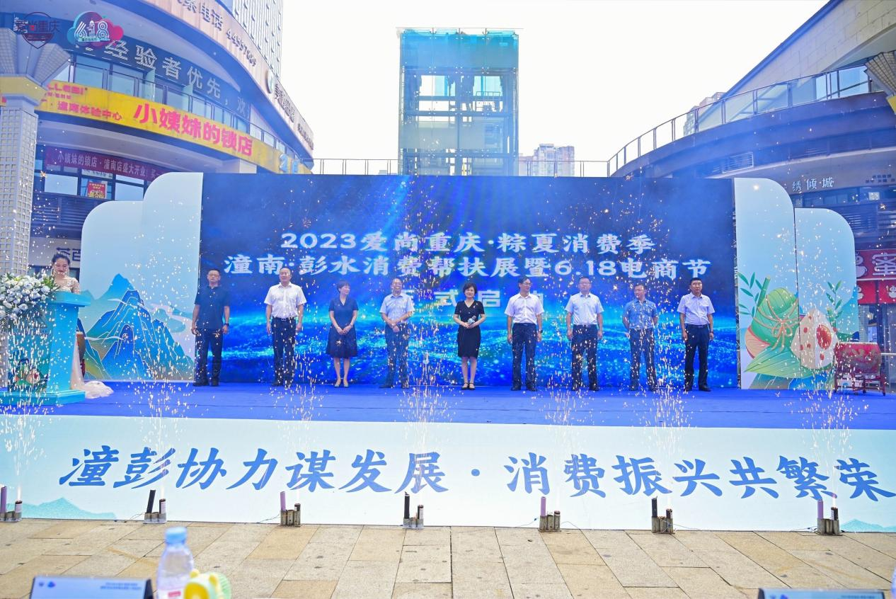 6月20日,“2023爱尚重庆.粽夏消费季-潼南·彭水消费帮扶展暨618电商节”启幕。重庆市商务委员会副主任王珏,潼南区委常委、宣传部长何礼兵,潼南区人大副主任陈默,潼南区人民政府副区长秦云兵,潼南区政协副主席谭红雁,彭水苗族土家族自治县副县长任孝云等领导及潼南区相关部门、23个镇街、潼彭两地企业代表出席启幕仪式。