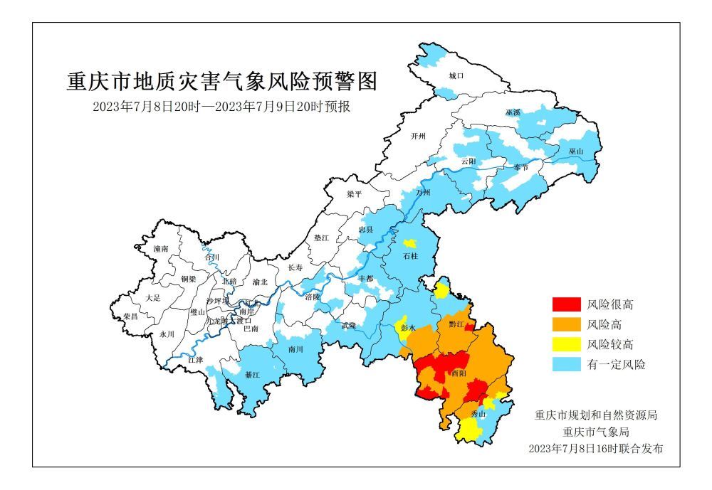 7月8日16时,重庆市规划和自然资源局、重庆市气象局联合发布全市地质灾害气象风险预警。预警显示,7月8日20时至7月9日20时,酉阳县、秀山县、黔江区属于风险很高地区,地质灾害气象风险等级为I级(红色预警)。