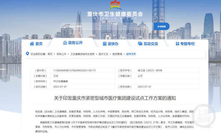 重庆6区试点紧密型城市医疗集团建设 推动优质医疗资源共享