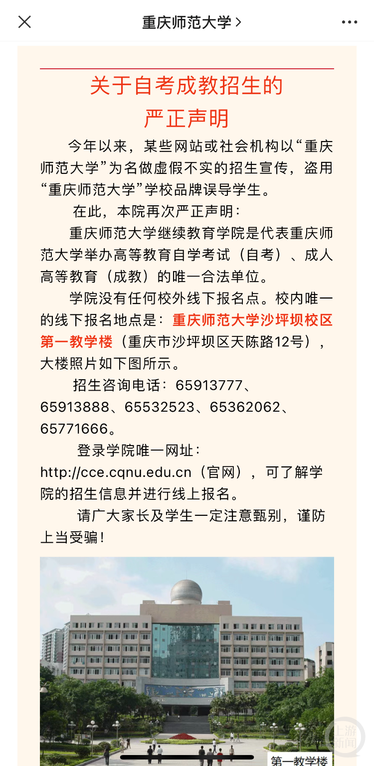 近日,重庆师范大学发布《关于自考成教招生的严正声明》,声明中提到,今年以来,某些网站或社会机构以“重庆师范大学”为名做虚假不实的招生宣传,盗用“重庆师范大学”学校品牌误导学生。