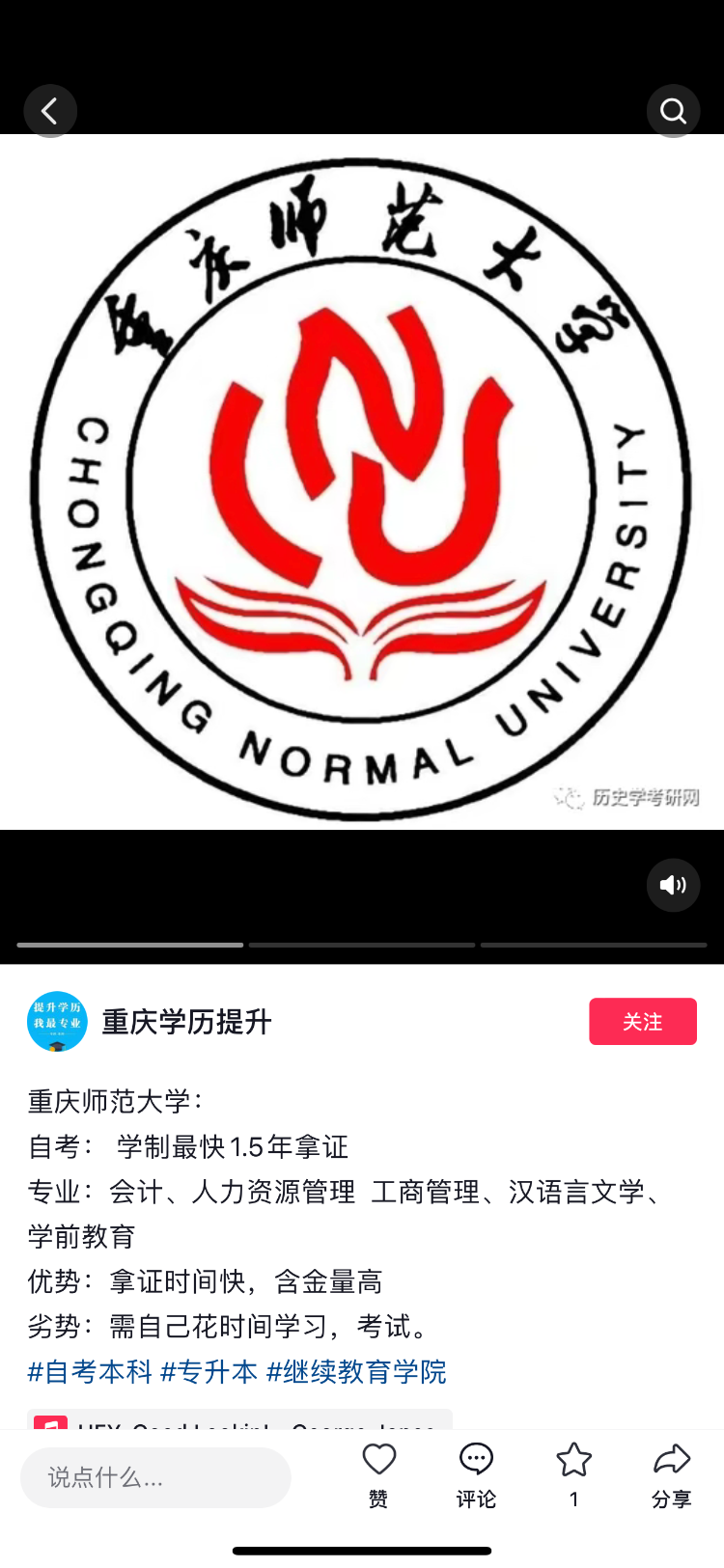 也有自媒体直接使用重庆师范大学校徽发布广告称,自考学制最快1.5年拿证,可报考会计、人力资源管理等专业,拿证时间快,含金量高。也有自媒体直接打着“重师继续教育”的名头,标注重庆师范大学(沙坪坝校区)定位发布广告,看起来十分“可信”。
