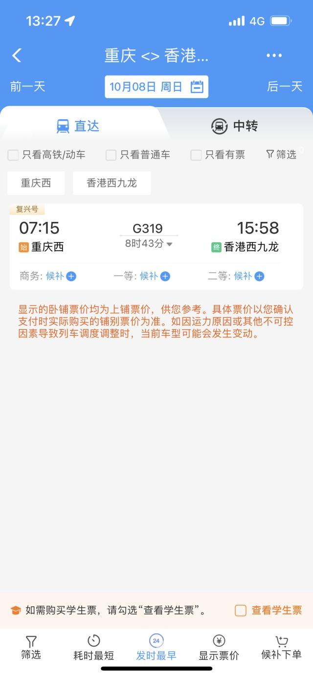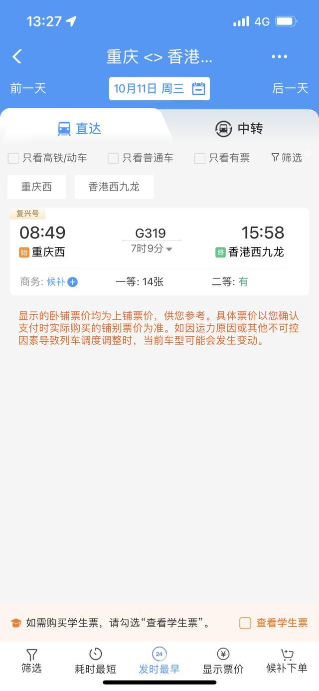 10月7日,记者查询铁路12306看到,从10月11日开始,重庆直达香港的G319次列车运行时间将缩短至7小时9分,重庆西站的发车时间为08:49,终至香港西九龙站的时间为15:58,较之前缩短了94分钟。票价方面也有所调整,其中,二等座票价717元,一等座票价1147元,商务座票价2092元。