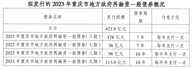 据中国债券信息网公布,2023年重庆市地方政府再融资一般债券(六期至九期)信息披露文件,2023年重庆市地方政府再融资一般债券(六期至九期 ),本批次债券发行总规模 421.9亿元,品种为记账式固定利率附息债券,7 年期债券利息按年支付,10 年期债券利息按半年支付到期后一次性偿还本金,10月16日10:30-11:10招标。募集资金投向说明中提到,发行地方政府再融资债券偿还存量债务。