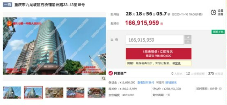 11月16日至11月17日,重庆市第一中级人民法院将在淘宝网司法拍卖网络平台,对重庆市九龙坡区渝州路33-13至18房地产公开整体拍卖,建筑面积25100.06平方米,起拍价1.66915959元,相当于评估价的7折,折合建面每平方米6649元。