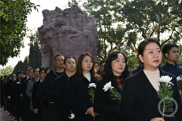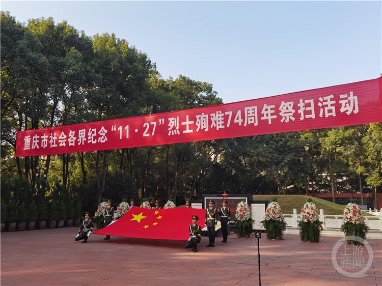 当天是重庆“11·27”烈士殉难74周年纪念日,社会各界代表齐聚现场缅怀先烈,开展祭扫活动。
