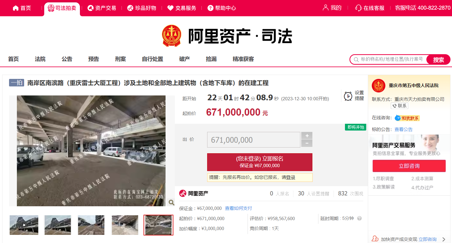 据阿里资产网站信息,12月7日,重庆雷士大厦在建工程将于12月30日拍卖,起拍价为6.71亿元。