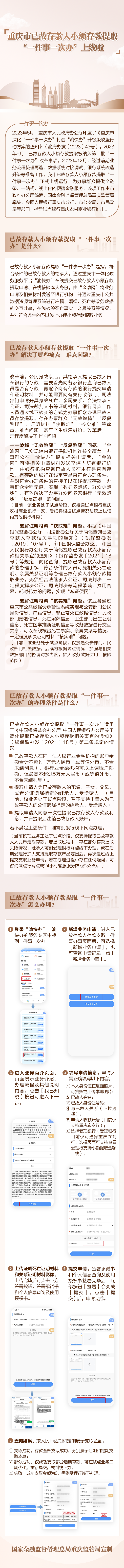 据介绍,在重庆市政府办公厅的统筹下,国家金融监督管理总局重庆监管局联合人民银行重庆市分行、市公安局、市民政局等部门,指导试点银行重庆农村商业银行推出已故存款人小额存款提取“一件事一次办”服务。