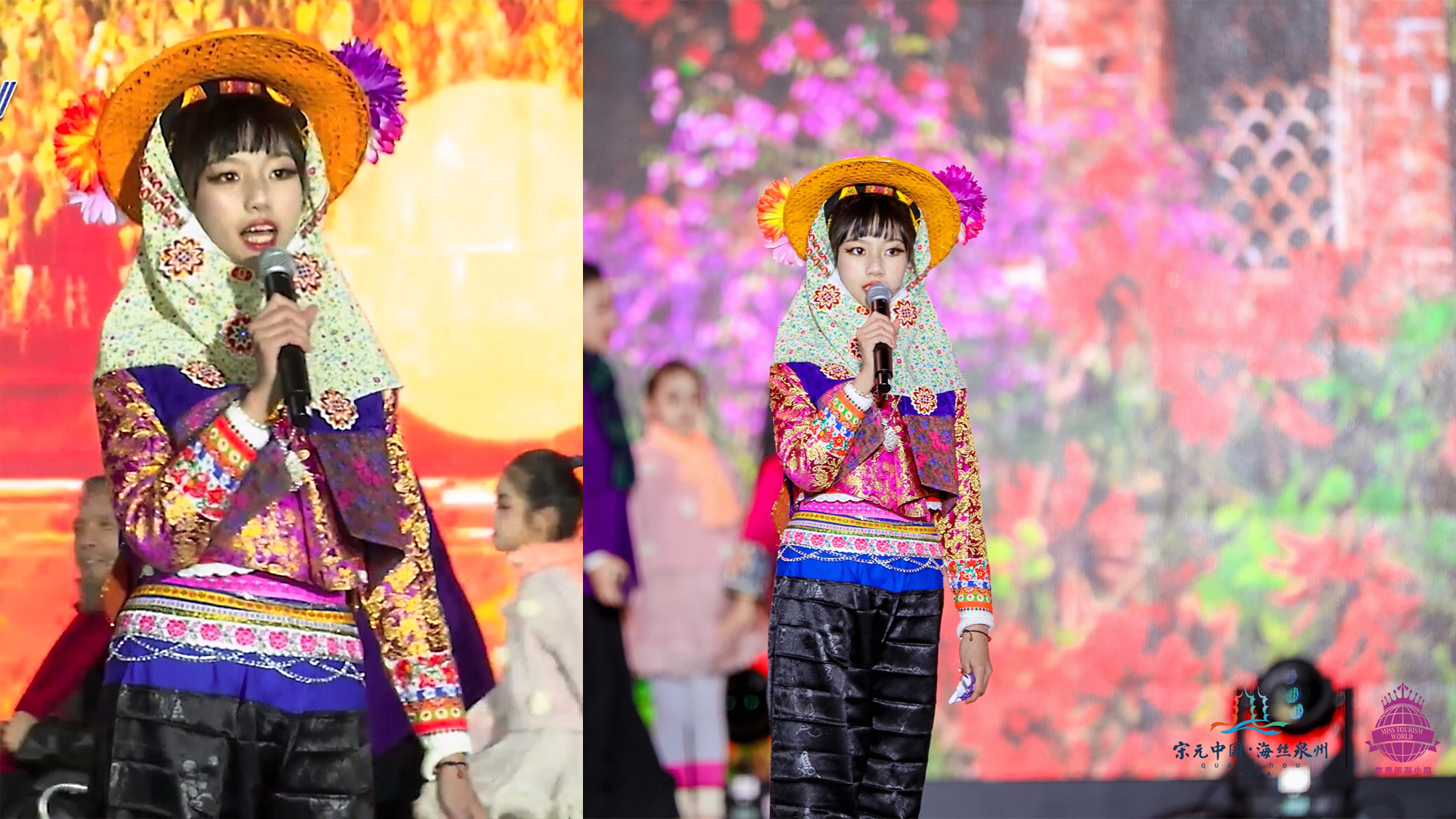 刘姿孜小朋友身穿惠安女服饰,是典型的泉州惠安渔家女的造型,也是国家级非物质文化遗产之一。在服装设计上,改良版民国时期的惠安女传统贴背、搭配上当代时尚刺绣惠安女节约衫,是非遗和时尚的完美结合。这位有着清透的嗓音“小惠安女”一出现,便迎来了全场的喝彩和掌声,来自世界各国的嘉宾和佳丽们纷纷点赞,成为了世界旅游小姐各国民族服饰展示环节后,一道展示泉州独有的国家级非遗服饰的靓丽风景。
