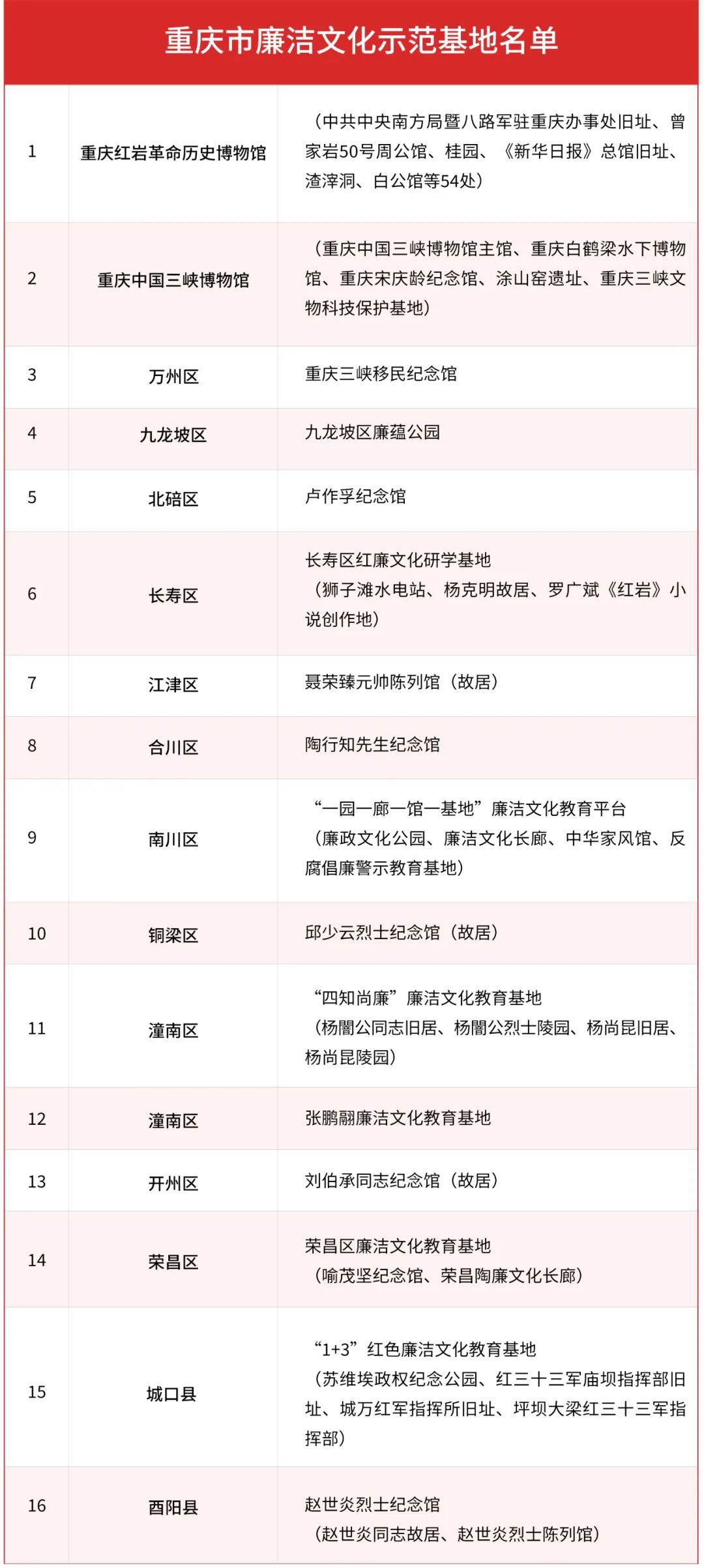 据了解,16个基地中既有具有品牌积淀,长期以来一直发挥着廉洁教育作用的基地,如重庆红岩革命历史博物馆、刘伯承同志纪念馆(故居)、聂荣臻元帅陈列馆(故居)等,又包含了新近挖掘打造且发挥作用较好的基地,如张鹏翮廉政文化教育基地、南川区“一园一廊一馆一基地”廉洁文化教育平台、九龙坡区廉蕴公园等。此外,16个示范基地的文化类型涵盖革命文化、中华优秀传统文化、社会主义先进文化,充分挖掘和呈现了不同文化类型中的廉洁元素。