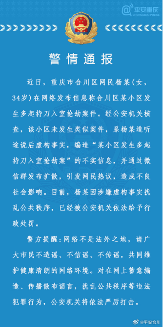 经公安机关调查,合川区网民杨某(女,34岁)道听途说后虚构事实,编造“某小区发生多起持刀入室抢劫案”的不实信息,并通过微信群发布扩散,引发网民热议,造成不良社会影响。