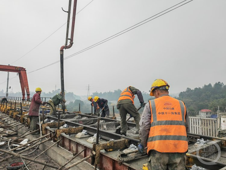 1月11日,记者从京昆高铁西昆公司获悉,近日随着中铁十一局集团渝昆高铁川渝段站前一标鸭子堡特大桥无砟轨道施工完成浇筑,标志着渝昆高铁渝宜段(重庆至宜宾段)完成无砟轨道施工,为渝宜段按期完成铺轨打下坚实的基础。