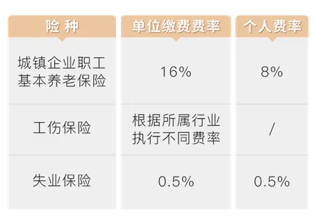 具体费率如何?缴纳城镇企业职工基本养老保险、工伤保险、失业保险比例按各险种现行政策执行。其中,工伤保险费率根据单位所属行业对应的工伤风险类别,执行相应的基准费率。一起来看看具体费率↓