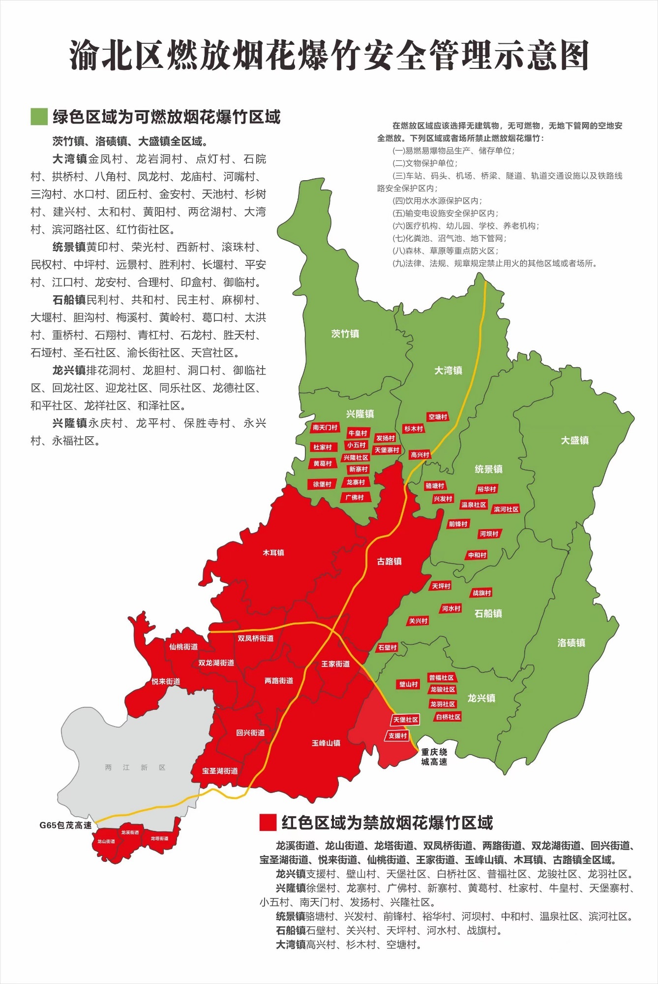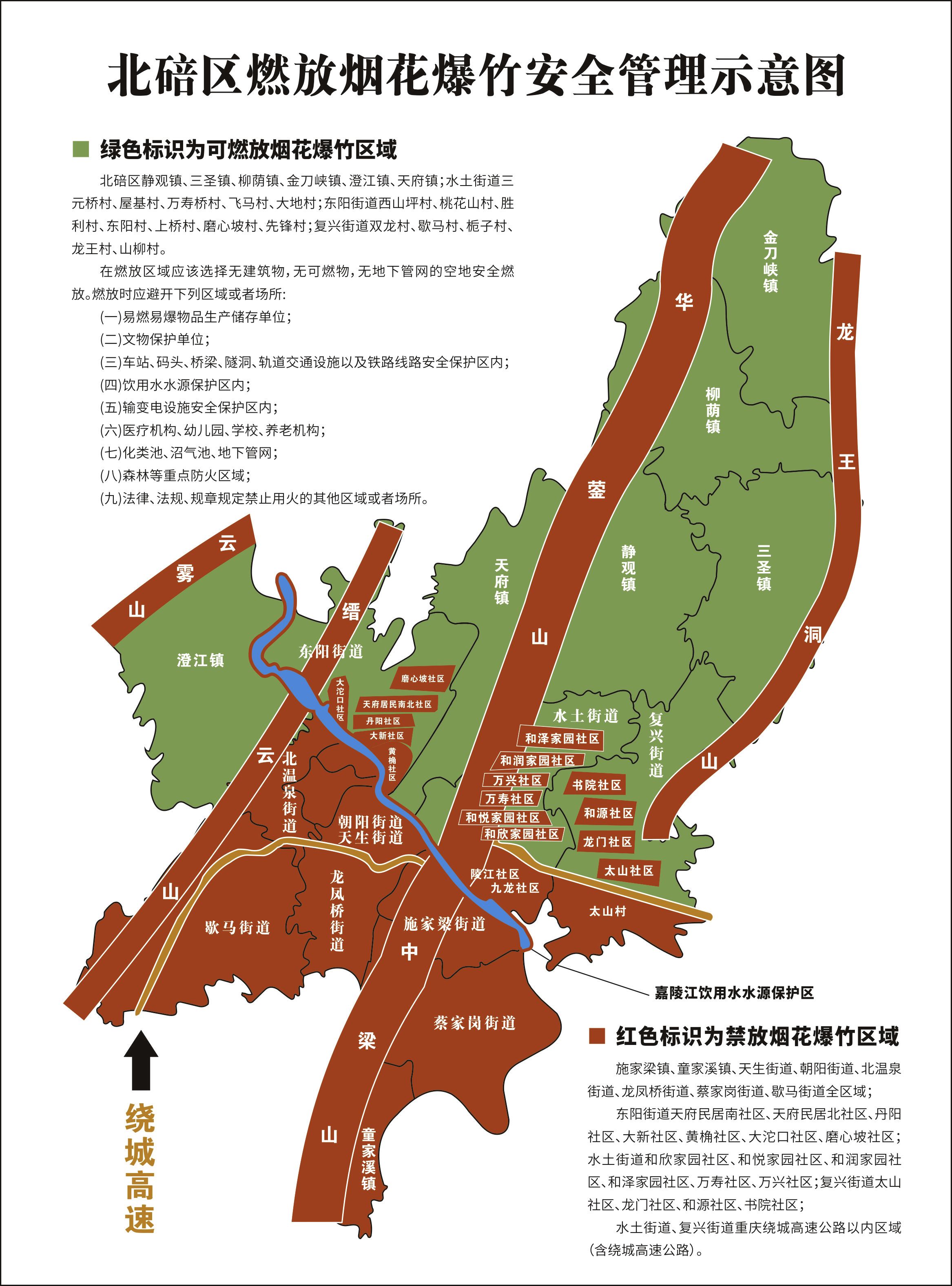 据介绍,重庆中心城区可以燃放烟花爆竹的区域主要集中在巴南区、渝北区、北碚区。具体区域为巴南区接龙镇、东温泉镇、木洞镇、圣灯山镇、安澜镇、石龙镇、姜家镇、麻柳嘴镇、丰盛镇、二圣镇、双河口镇、石滩镇、天星寺镇;一品街道乐遥村、燕云村、七田村、一品社区、五角亭社区、四桥村3—6组、桥口坝村1—3和5组、永益村1—3和5—9组;南彭街道鸳鸯村、天台山村、清风桥村、塔落村、将军湾村、断桥村、水竹村、石岗社区、南彭社区,高碑村1—11组、石桥组、大寺组、面房组、灯草沟组,巨龙桥村青龙湾组、秦家沟组、周家坡组、方家湾组、楼房沟组、潘家口组,大石塔村双龙沟组、斑竹林组、张家堡组、刘家湾组、沙咀组、书院社,大鱼村1—2组、4—11组、20—28组、32组;惠民街道显灵村、胜天村,晓春村枇杷社、土米社、黄泥社、雀坪社、凉水社、黄金社、申家坪社、桂花社、曹房社、晓春社、大塘湾社,辅仁村古时社、甲子社、坪房社、老房社、石坝社、家榜社、杨家社、水井社,沙井村美和社、搭桥社、大沟社、土地社、周家湾社、堰湾社。渝北区的茨竹镇、洛碛镇、大盛镇;大湾镇金凤村、龙岩洞村、点灯村、石院村、拱桥村、八角村、凤龙村、龙庙村、河嘴村、三沟村、水口村、团丘村、金安村、天池村、杉树村、建兴村、太和村、黄阳村、两岔湖村、大湾村、滨河路社区、红竹街社区;统景镇黄印村、荣光村、西新村、滚珠村、民权村、中坪村、远景村、胜利村、长堰村、平安村、江口村、龙安村、合理村、印盒村、御临村;石船镇民利村、共和村、民主村、麻柳村、大堰村、胆沟村、梅溪村、黄岭村、葛口村、太洪村、重桥村、石翔村、青杠村、石龙村、胜天村、石垭村、圣石社区、渝长街社区、天宫社区;龙兴镇排花洞村、龙胆村、洞口村、御临社区、回龙社区、迎龙社区、同乐社区、龙德社区、和平社区、龙祥社区、和泽社区;兴隆镇永庆村、龙平村、保胜寺村、永兴村、永福社区。北碚区静观镇、三圣镇、柳荫镇、金刀峡镇、澄江镇、天府镇;水土街道三元桥村、屋基村、万寿桥村、飞马村、大地村;东阳街道西山坪村、桃花山村、胜利村、东阳村、上桥村、磨心坡村、先锋村;复兴街道双龙村、歇马村、栀子村、龙王村、山柳村。