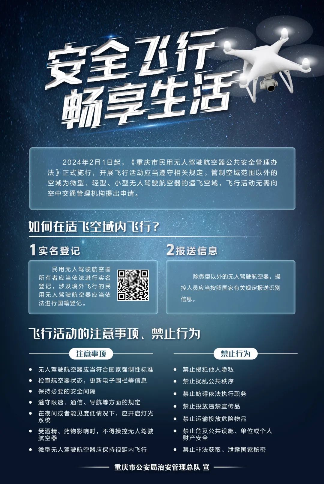 1月30日,重庆市公安局治安管理总队发布提醒。2024年2月1日起,《重庆市民用无人驾驶航空器公共安全管理办法》(以下简称《办法》)正式施行,民用无人驾驶航空器未实名登记进行飞行活动的,将按相关法律法规,给予最高2万元以下的罚款。