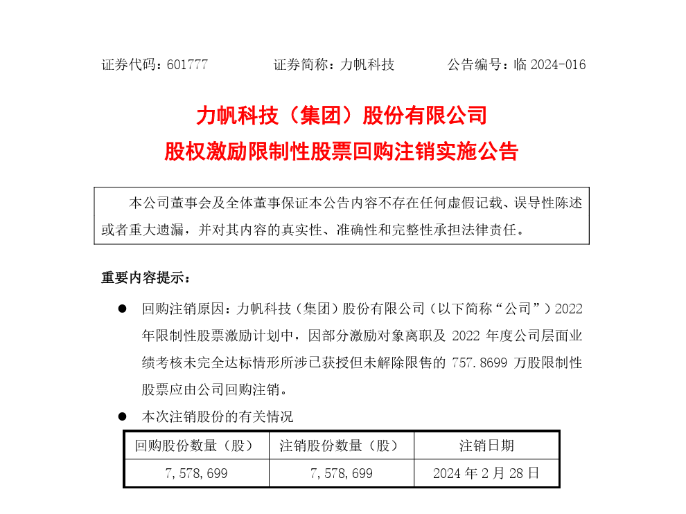 2月25日消息,力帆科技公告,因部分激励对象离职及2022年度公司层面业绩考核未完全达标,公司将回购注销已获授但未解除限售的757.87万股限制性股票。回购股份数量为757.87万股,注销日期为2024年2月28日。