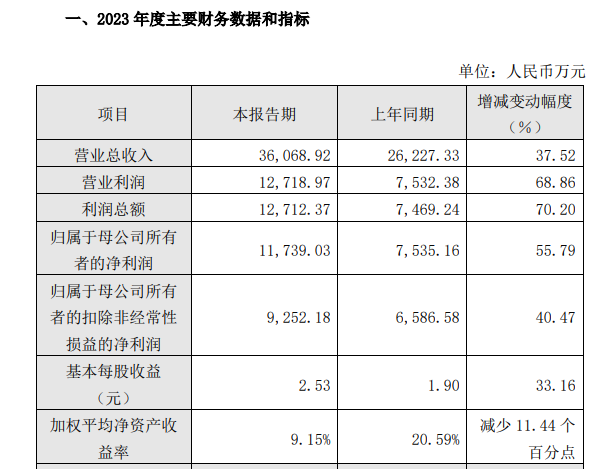 2023 年公司实现营业总收入 36,068.92 万元,较上年增长 37.52%;实现营业利润 12,718.97 万元,较上年增长 68.86%;实现利润总额 12,712.37 万元,较上年增长 70.20%;实现归属于母公司所有者的净利润 11,739.03 万元,较上年增长 55.79%;实现归属于母公司所有者的扣除非经常性损益的净利润9,252.18 万元,较上年增长 40.47%。报告期末,公司总资产 231,804.72 万元,较年初增长 344.29%;归属于母公司的所有者权益 216,070.35 万元,较年初增长 431.70%;归属于母公司所有者的每股净资产 27.68 元,较年初增长 170.84%。