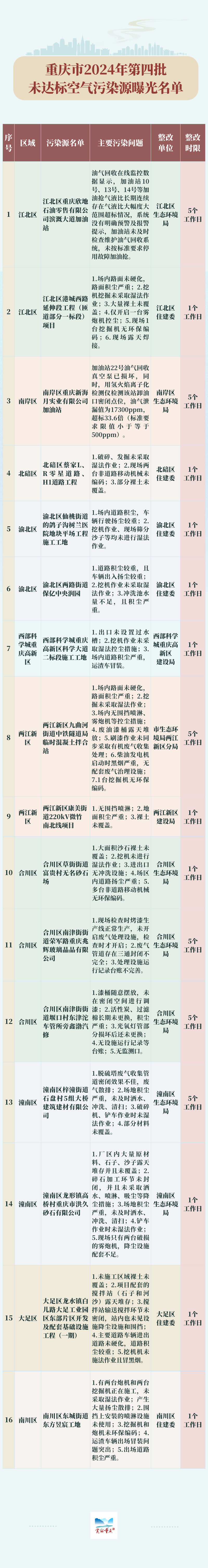 为全力打好“治气”攻坚战,近日,重庆市综合督导帮扶组检查发现部分工业企业、施工工地未严格落实大气污染防治措施,并曝光了2024年第四批未达标空气污染源名单。