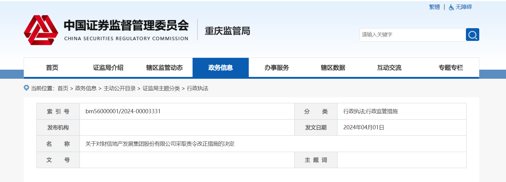 近日,据重庆证监局官网消息,财信地产发展集团股份有限公司(简称财信发展)收到中国证券监督管理委员会重庆监管局下发的《关于对财信地产发展集团股份有限公司采取责令改正措施的决定》和《关于对鲜先念、王福顺、闫大光采取出具警示函措施的决定》。