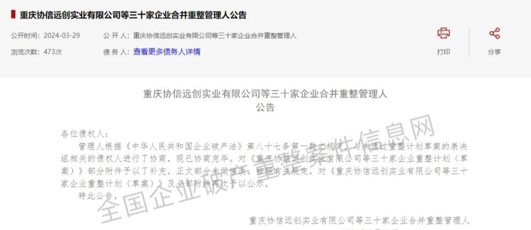 4月7日,重庆协信远创实业公司及其旗下29家全资子公司合并重整案成为迄今为止最大房企破产重整案。3月29日,全国企业破产重整案件信息网刊登了《重庆协信远创实业公司等三十家企业合并重整管理人公告》。