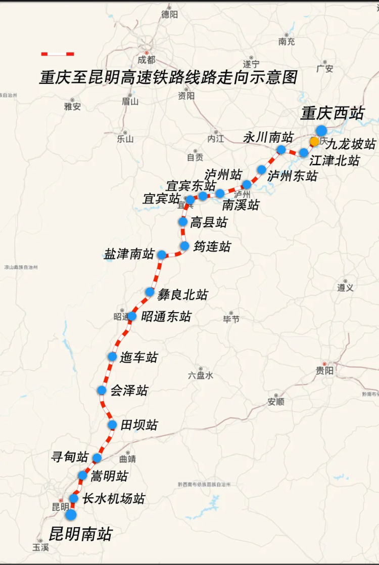 渝昆高铁是全国铁路网“八纵八横”主通道之一京昆通道的重要组成部分,线路起自重庆西站,途经重庆市、四川省、贵州省和云南省,接入昆明南站,全长699公里,设计时速350公里。先期开建的渝昆高铁渝宜段从重庆枢纽重庆西站引出,经重庆九龙坡区、重庆江津区、四川泸州市、四川宜宾市等地,接入宜宾站。