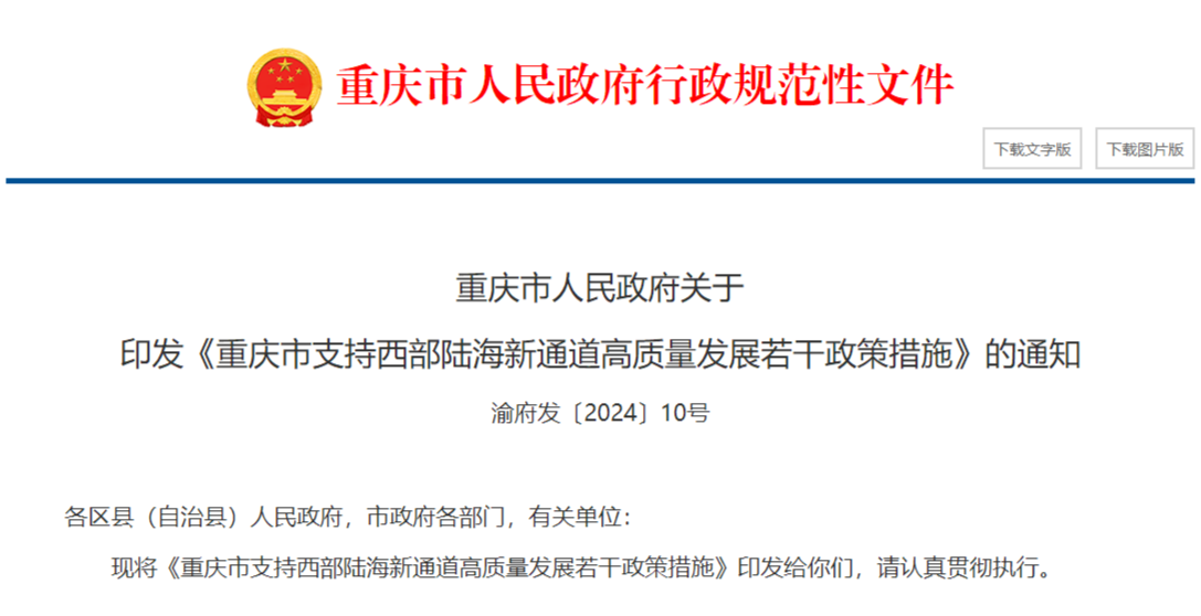 4月25日,重庆市人民政府印发《重庆市支持西部陆海新通道高质量发展若干政策措施》。以下为内容全文。