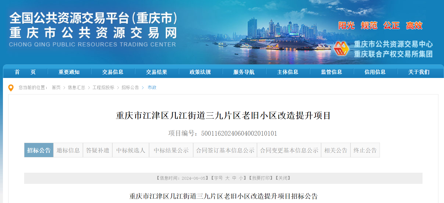 2024年6月4日,重庆市公共资源交易网发布《重庆市江津区几江街道西门路片区老旧小区改造提升项目的中标结果公示》,其中提到了项目概况与建设规模。