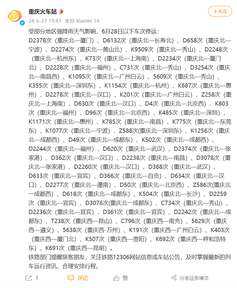 6月27日晚,重庆火车站发布消息称,受部分地区强降雨影响,为确保旅客列车运行安全和旅客出行安全,铁路部门决定停运途经相关区段的列车。
