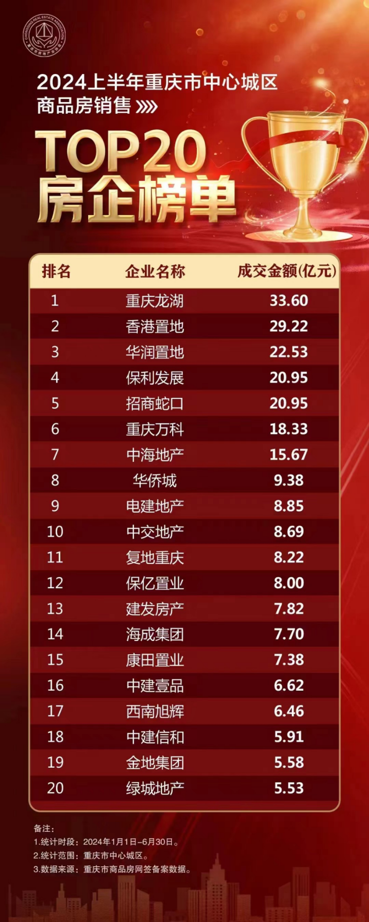 7月4日,重庆市房地产业协会公布了2024年上半年重庆市中心城区商品房销售TOP20房企榜单。