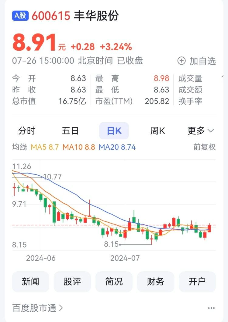 7月26日,丰华股份报收8.91元,涨3.24%,换手率0.73%,滚动市盈率205.32,总市值16.75亿元。