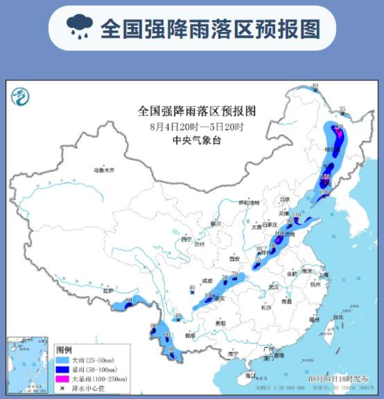 预计,8月4日20时至5日20时,黑龙江中西部、吉林中部、辽宁中北部和东部、山东大部、河南东北部和西南部、四川东部和南部、重庆北部和西部、云南西部等地部分地区有大到暴雨,其中,黑龙江中部、辽宁东部、山东北部和西南部、四川盆地东南部等地部分地区有大暴雨(100~180毫米)。上述部分地区伴有短时强降水(最大小时降雨量40~60毫米,局地可超过80毫米),局地有雷暴大风等强对流天气。