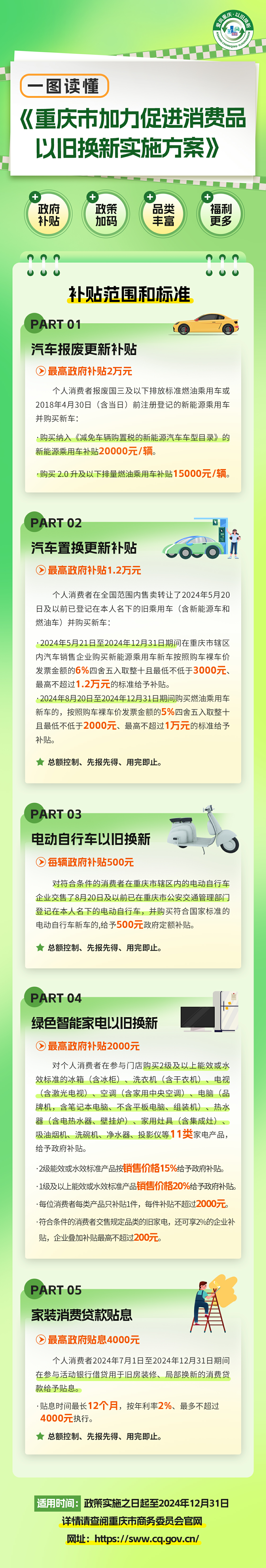 在此基础上,近日,重庆市新制定出台了《重庆市加力促进消费品以旧换新实施方案》(以下简称《方案》)及配套系列文件,对汽车报废更新、汽车置换更新、家装消费贷款贴息等三项政策给予优化升级调整,新增制定出台绿色智能家电以旧换新、电动自行车以旧换新等两项补贴政策。其中,汽车以旧换新最高补贴标准由0.3万元提高至1.2万元、绿色智能家电以旧换新最高补贴2000元、家装消费贷款贴息最高补贴4000元。