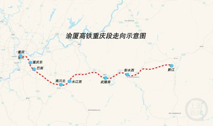 渝厦高铁重庆段(重庆站至黔江站)从重庆中心城区到黔江区,全长269.5公里,是国家中长期铁路网规划的“八纵八横”高铁网中渝厦通道的重要组成部分。此次贯通的是渝厦高铁重庆东至黔江段,全长247.73公里,目前,渝厦高铁重庆段仅剩重庆至重庆东的重庆菜园坝长江铁路隧道还未贯通,正在按施工计划稳步推进。