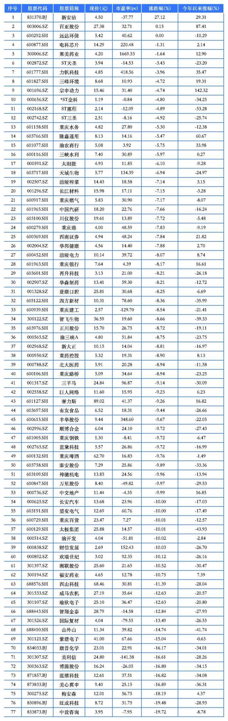 76家交易中的重庆A股有2家上涨,74家下跌。