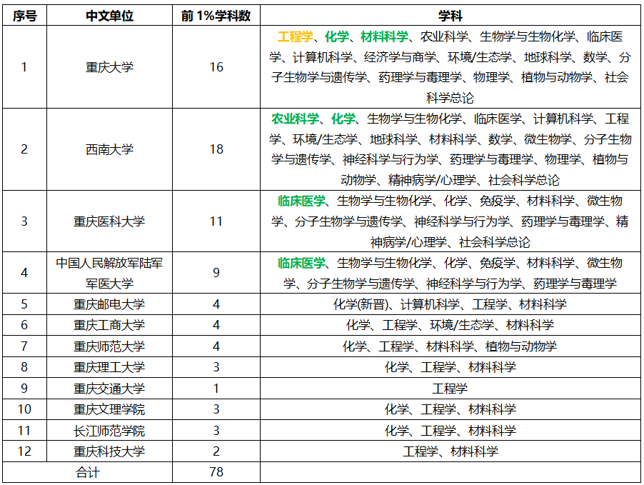 重庆市高校进入ESI全球前1%的学科情况(2024年9月)