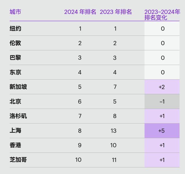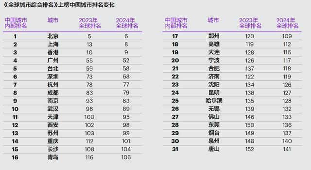中国共有3个城市跻身全球前10名,分别是北京(第6)、上海(第8)和香港(第9)。