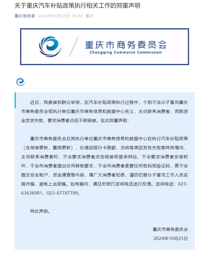 25日,重庆市商务委员会发布了关于重庆汽车补贴政策执行相关工作的郑重声明。声明中指出,个别不法分子冒充重庆市商务委员会或执行单位重庆市商务信息和数据中心名义,主动联系消费者,谎称资金发放失败,要求消费者点击不明链接。