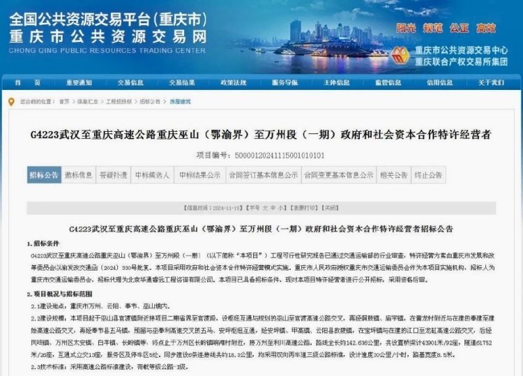 日前,重庆市公共资源交易网显示,G4223武汉至重庆高速公路重庆巫山(鄂渝界)至万州段(一期)政府和社会资本合作特许经营者发布招标公告。标志着这一重大工程即将进入实施阶段,计划12月底开工。