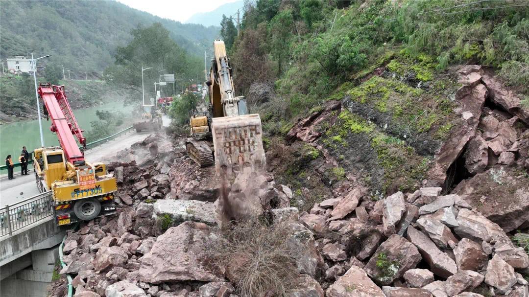 在救出两辆吊车和一辆小车之后,公路部门按照先保通再保畅的原则,采取“先碎再清”的措施,对现场的巨石进行破碎,排除险情,“预计26日可半幅通车,28日前实现全幅通车。”