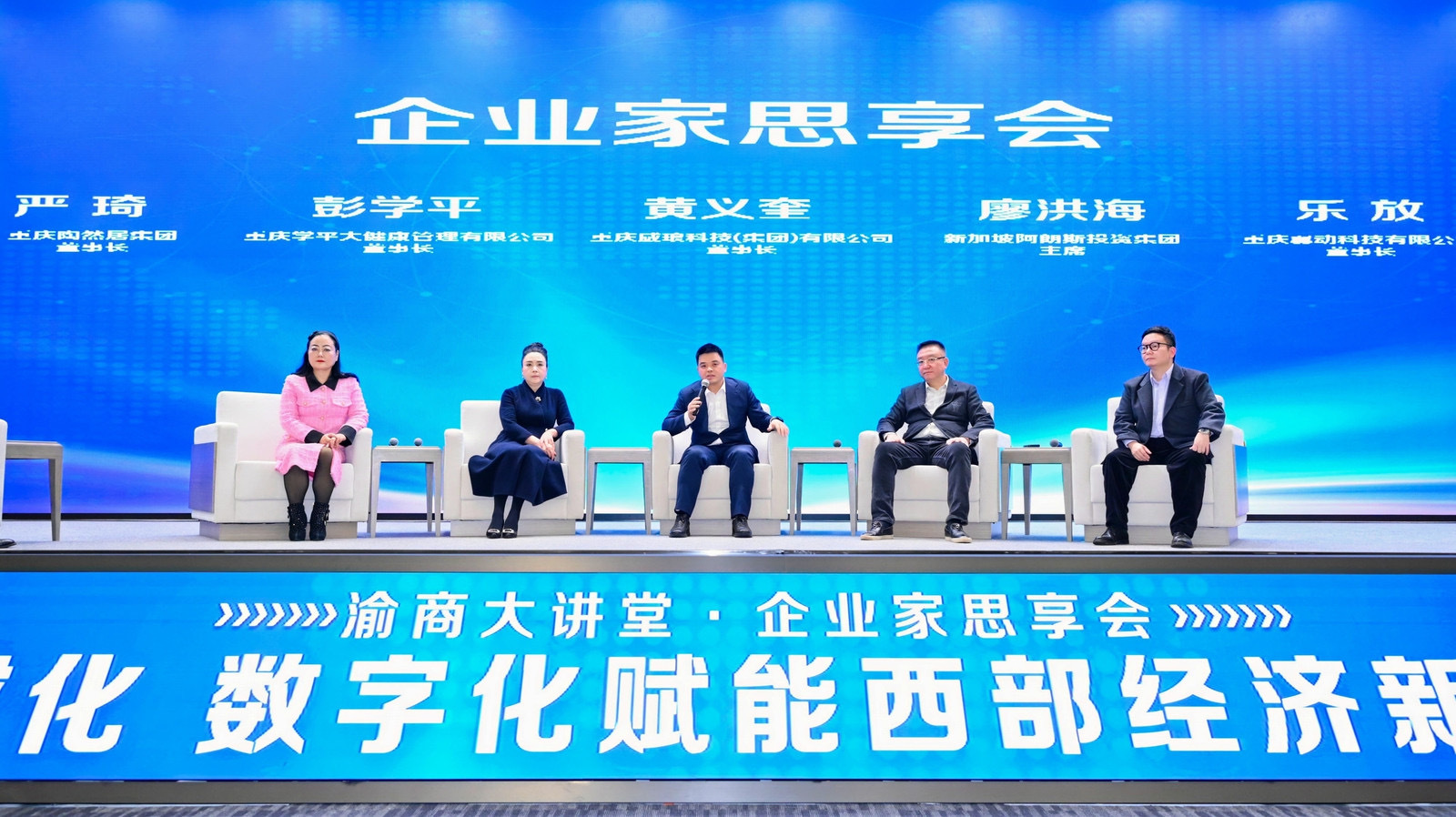 随后,现场还进行了企业家思享会,重庆陶然居集团董事长严琦、学平大健康产业集团有限公司董事长彭学平、重庆威琅科技(集团)有限公司董事长黄义奎、新加坡阿朗斯投资集团主席廖洪海、重庆翼动科技有限公司董事长乐放共5位来自重庆的优秀民营企业家代表在圆桌对话中交流了数字化实践经验,带来企业家第一视角的经验分享与行业洞察。