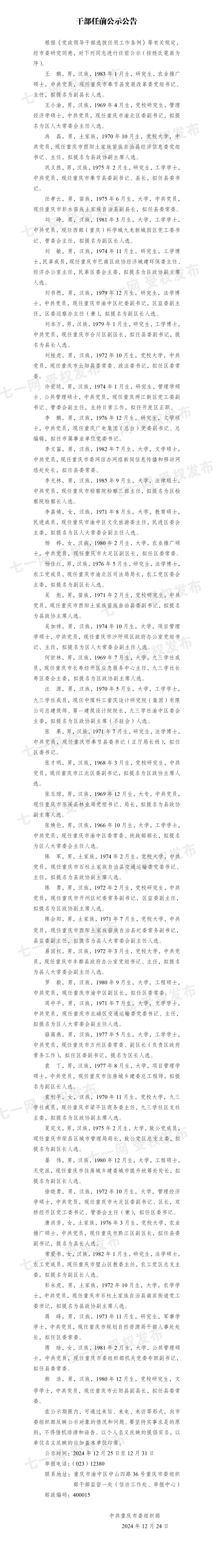 12月24日,中共重庆市委组织部发布干部任前公示公告,根据《党政领导干部选拔任用工作条例》等有关规定,经市委研究同意,对多名干部进行任前公示,详情如下: